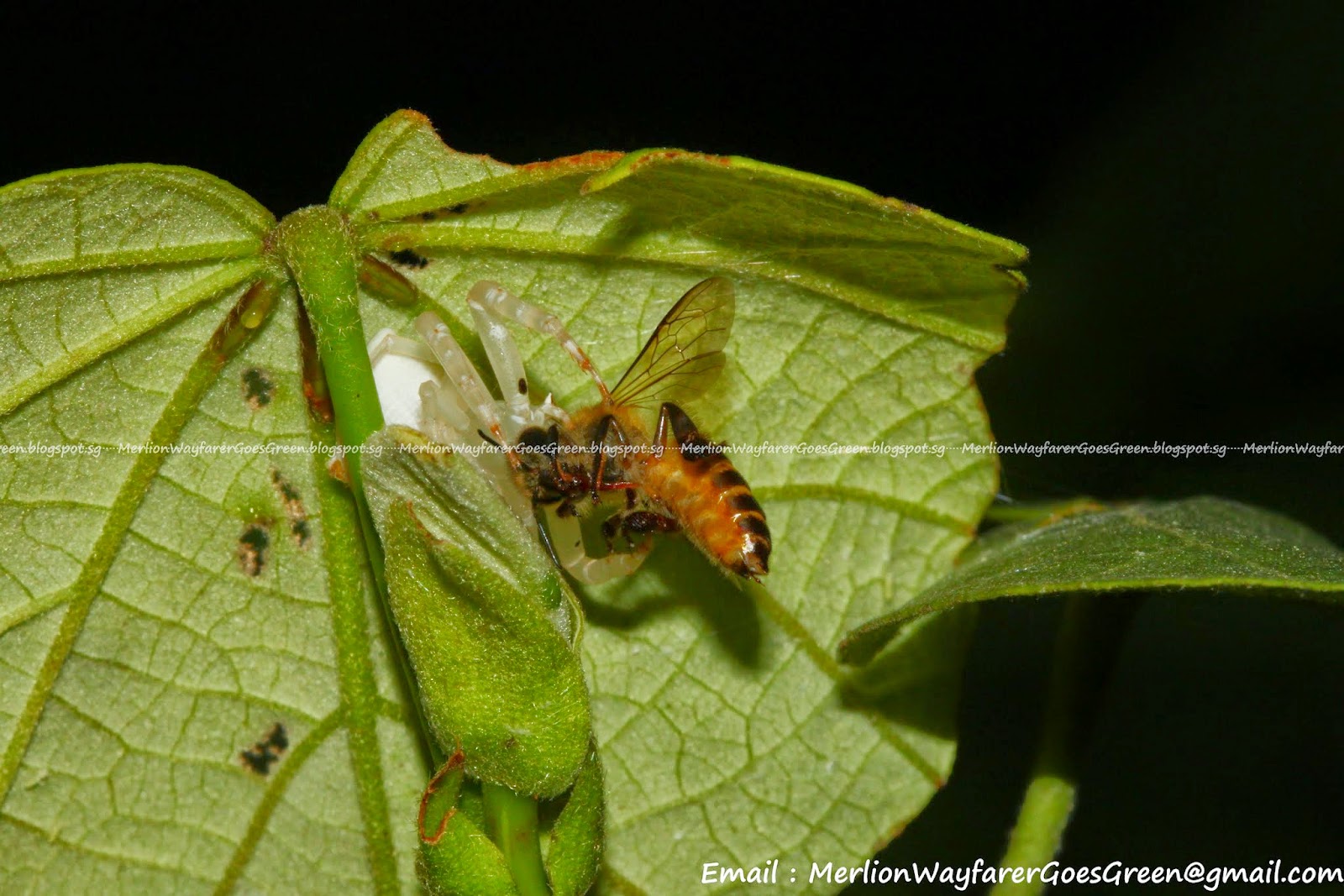 Initially this looked like a bee stopping for a rest on a leaf. But then, bees do not stop on the underside of leaves to rest. And look what's grasping the bee - a Misumenops nepenthicola (White Nepenthes Crab Spider)! Such is the wonder of the macro world! You get surprise finds by zooming in on your photos on a larger screen...